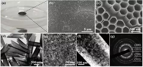 图2(a)水中P-PdNTA的照片。(b)P-PdNTA阵列低倍扫描图像。(c)b图中白色矩形区域放大图像。(d)P-PdNTA透射电镜图像。其中半透明度显示出中空结构。(e)P-PdNTA高倍透射电镜图像。(f)单根P-PdNTA透射电镜图像。(g)f图中钯纳米管选区电子衍射图像。