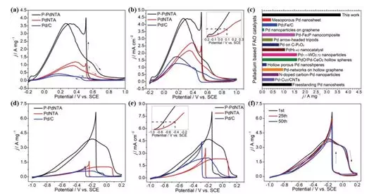 图5.(a,b)P-PdNTA,PdNTA和Pd/C样品在50 mV s–1的0.5 M H2SO4 + 0.5 M HCOOH溶液中的CV曲线,通过(a)Pd质量和(b)ECSA归一化。(c)在对HCOOH氧化的催化电流方面,P-PdNTA和现有技术的Pd基催化剂之间的比较。(d,e)在50 mV s–1的0.5 M KOH + 0.5 M HCOOK溶液中的P-PdNTA,PdNTA和Pd/C样品的CV曲线,用(d)Pd质量和(e)ECSA标准化。(f)在0.5 M KOH + 0.5 M HCOOK溶液中测试的P-PdNTA的CV曲线的第1次,第25次和第50次循环。(b)和(e)中的插图突出了阳极扫描中的起始电位。