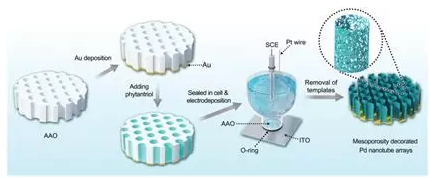 一维纳米管结构凭借其优异的物质传输特性引起广泛重视。但是,众多的纳米管的合成方法均得到粉末状产物。粉末产物的聚集很大程度上减少了活性表面积及暴露的催化活性位点,降低了其利用率。集流体上垂直生长钯纳米管阵列可以有效改善粉末产物聚集问题,并且通过调控纳米管长度控制催化剂负载量,以及实现快速反应动力学。但是目前基于模板电沉积的方法得到催化剂均为一维纳米线形貌。稳定的钯催化剂纳米管阵列的制备因其需要控制模板中钯沉积位置,速度以及产物生长方向,面临诸多挑战。