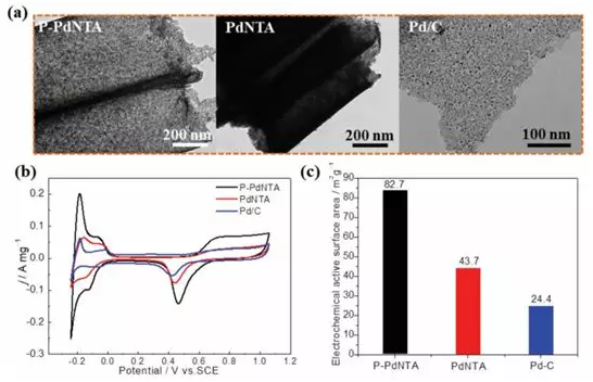 图4 (a)P-PdNTA,PdNTA和Pd/C的透射电子图像。(b)P-PdNTA,PdNTA和Pd/C在0.5 M硫酸中的循环伏安曲线。扫描速率为50 mV s–1。(c)基于(b)中的循环伏安曲线计算的电化学活性面积ECSA值。
