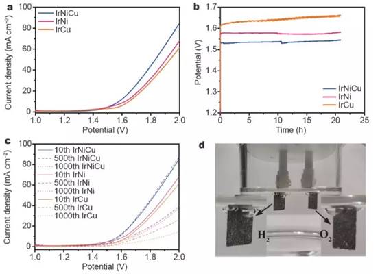 图2 IrNiCu HCSA, IrNi NA 和 IrCu NA的全解水性能。