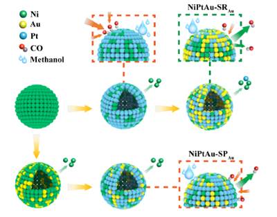 Figure 1 Schematic diagram of the synthetic route ofNiPtAu-SRAuand NiPtAu-SPAuHNCs. Two trimetallic NiPtAu HNCs with different surface compositions and structures prepared by the diagrammatic process have different resistance to CO, one of the MOR intermediate products.