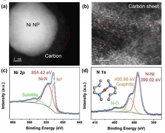 图3 Ni-NC@Ni的结构表征(a,b)Ni-NC@Ni的HAADF-STEM图像,显示了Ni原子在碳骨架中的原子分散。(c,d)Ni-NC@Ni的高分辨率Ni 2p和N 1s XPS光谱。(d)的插图显示了Ni–N物种的可能原子结构。