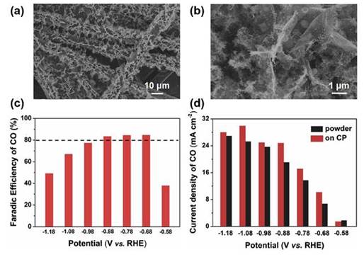 图5 Ni-NC@Ni/CP的形貌和电化学性能表征(a,b)Ni-NC@Ni/CP的SEM图像。(c)不同电位下Ni-NC@Ni/CP的CO法拉第效率。(d)不同电位下Ni-NC@Ni粉末和Ni-NC@Ni/CP的 CO电流密度。