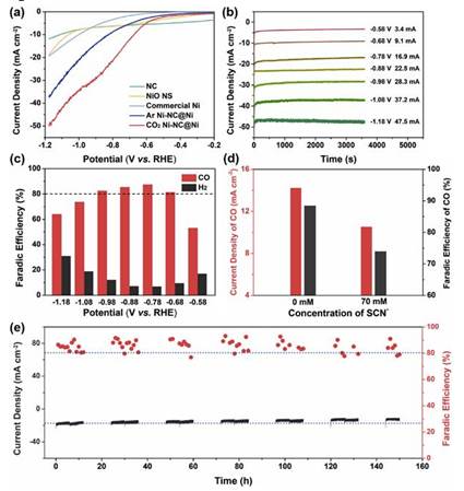 图4 Ni-NC@Ni的电化学性能表征(a)Ni-NC@Ni、ZIF-8衍生的氮掺杂碳(NC)、商业镍粉和NiO纳米片在CO2饱和的0.5 M KHCO3溶液中及Ni-NC@Ni在Ar饱和的0.5 M KHCO3溶液中的LSV曲线。(b)Ni-NC@Ni在不同电位下3600 s的CO2电还原计时电流图。(c)在不同电位下,Ni-NC@Ni的CO2还原产物的法拉第效率。(d)Ni-NC@Ni在-0.78 V vs. RHE偏压下,在电解液中加入0 mM和70 mM KSCN得到的CO的电流密度和法拉第效率。(e)Ni-NC@Ni在-0.78 V vs. RHE的条件下运行150 h的CO2还原的长期稳定性。黑线表示电流密度(mA cm-2),红点表示法拉第效率(%)。