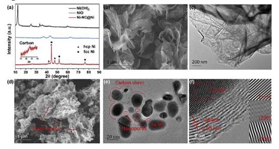图2 Ni-NC@Ni的形貌表征(a)Ni(OH)2、NiO纳米片和Ni-NC@Ni的XRD图谱。(b,c)NiO纳米片的SEM图像和TEM图像。(d,e)Ni-NC@Ni的SEM图像和TEM图像。(f)Ni-NC@Ni的高分辨率TEM图像和红色方块区域对应的三种晶格条纹。
