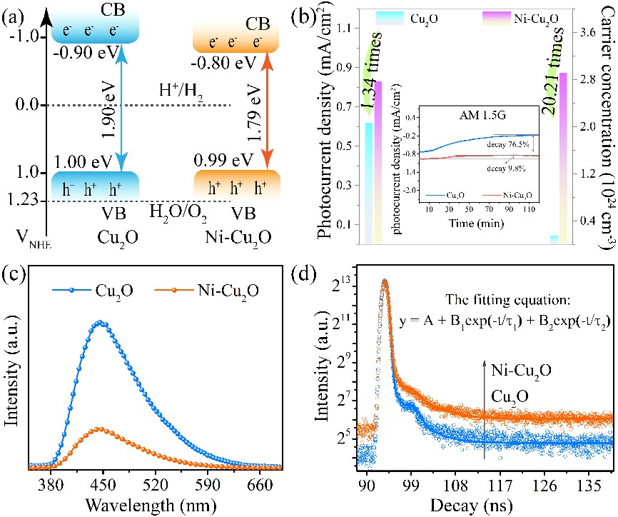 Figure 2. The characterizations of Ni-Cu2O and Cu2O. (a) Energy levels. (b) Photocurrent density, carrier concentration, and photostability. (c) PL plots. (d) TRPL decays.