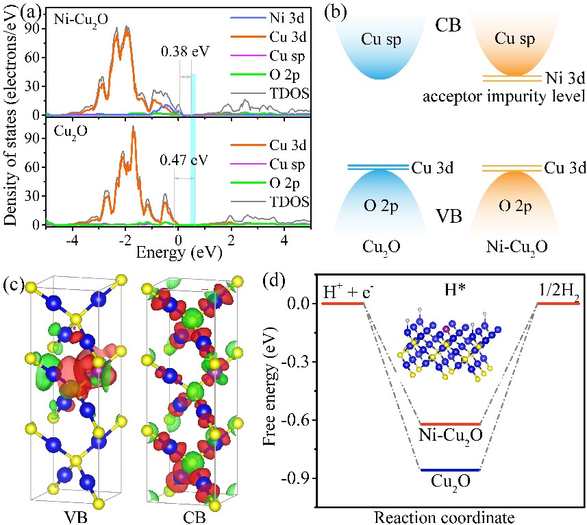 Figure 1. DFT calculations of Cu2O and Ni-Cu2O. (a) PDOS. (b) Energy level diagrams. (c) Difference charge density of Ni-Cu2O at VB and CB. (d) The free-energy diagram of HER at equilibrium potential. Structural model: Cu blue, O yellow, Ni purple, H gray.