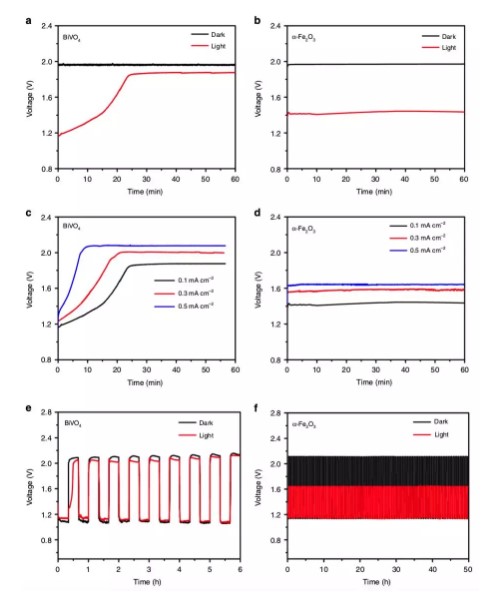 要点1:该光促进锌空气电池使用BiVO4或α-Fe2O3空气光电极,初始充电电位约1.20 ~ 1.43 V,相比传统锌空气电池降低了约0.5 ~ 0.8 V的充电电势。