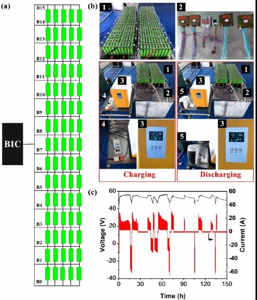 Fig. 7 The application of ZNB stack on the energy storage system: (a) the schematic diagram of a battery pack connected with BMS. (b) The photo of a 10 kWh ZNB energy storage system (1. ZNB stack with 300 batteries, 2. BMS, 3. PCS, 4. Power strip connected to the grid, 5. radiator). (c) The operating voltage and current versus time for the ZNB stack in the 10 kWh ZNB energy storage system for 150 h.