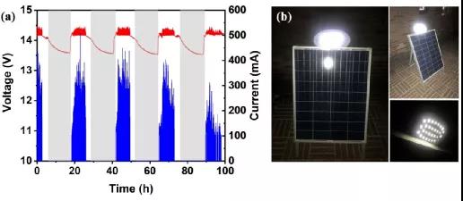Fig. 6 The application of ZNB stack on the solar power system: (a) The operating voltage and current versus time for the 12 V ZNB stack of the solar power system for 100 h (The data is recorded from 10:36 a.m. in the first day). (b) The photo of the lamp powered by the 12 V ZNB stack in the solar power system at night.