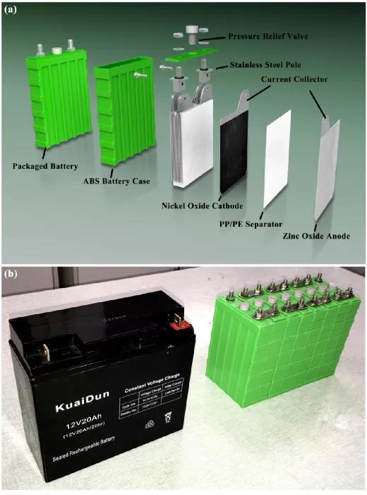 Fig. 1 (a) The schematic diagram of the single ZNB. (b) The photo of the 12 V/20 Ah LAB stack (left) and the 12 V/20 Ah ZNB stack (right).