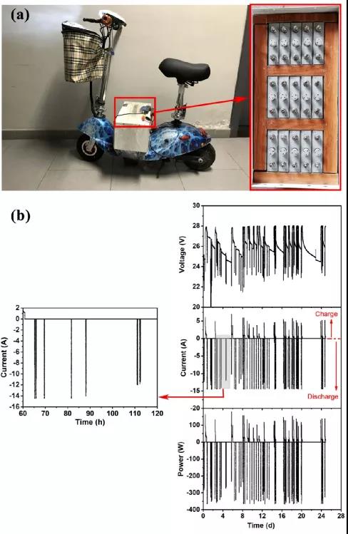 Fig. 4 The application of ZNB stack on electric bicycle: (a) Photo of 15 zinc-nickel batteries before packing (right) and an electric bicycle with 24 V ZNB stack installed. (b) The operating voltage, current, and power versus time for 24 V ZNB stack in the electric bicycle for 25 days.