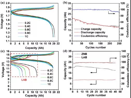 Fig. 3 The electrochemical performance of batteries: (a) charge–discharge profiles of single ZNB at different rates from 0.2C to 1C; (b) cycling performance of single ZNB at discharge-charge rate of 1C and DOD of 100%; (c) charge–discharge profiles of ZNB stacks and commercial LAB stack at different rates from 0.2C to 1C; (d) cycling performance of ZNB stacks and commercial LAB stack at discharge-charge rate of 1C and DOD of 100%.