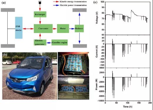 Fig. 5 The application of ZNB stack on HEV: (a) The schematic diagram of HEV. (b) The photo of HEV (left) and its assembled 75 V ZNB battery stacks (right). (c) The operating voltage, current, and power versus time for 75 V zinc-nickel battery stack in the HEV.