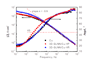 图2 铜及三维石墨烯/Cu复合材料在NaCl中浸泡1h后的Bode图(欧姆电阻校正后)