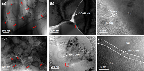 图1 热压态纯铜、热压态和热轧态三维石墨烯/Cu复合材料显微组织的TEM照片