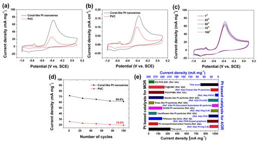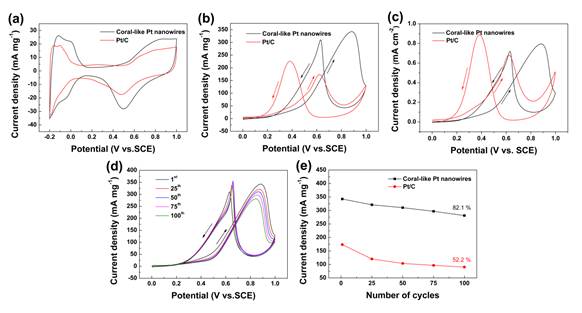 图5. a)珊瑚形貌Pt纳米线和商业Pt/C在0.5 M H2SO4中的循环伏安曲线以及对甲醇氧化催化的b) Pt质量和c) ECSA归一化循环伏安曲线。d)不同循环次数的甲醇氧化催化循环伏安曲线。e)甲醇氧化正向阳极峰值电流随循环次数变化函数图。