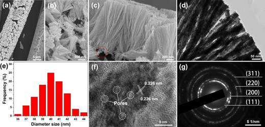 图2. a−c)珊瑚形貌Pt纳米线的SEM图,d) TEM图,e)直径尺寸分布柱状图,f) HRTEM图和g)相应的SAED图