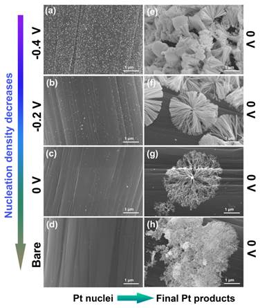 图3. a−c)在不同沉积电位下获得的Pt晶核SEM图,d)碳纤维SEM图。e−h)以植烷三醇溶致液晶为模板,沉积电位为0 V(vs. SCE)时获得的相应Pt沉积产物SEM图