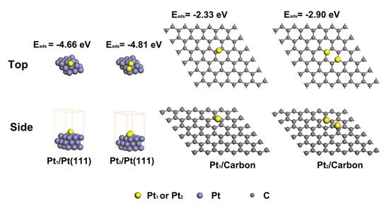 图4. Pt(111)和碳表面Pt原子最稳定吸附构型俯视图(上)和侧视图(下)