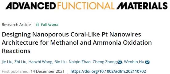 Jie Liu,Zhi Liu,Haozhi Wang,Bin Liu,Naiqin Zhao,Cheng Zhong*,Wenbin Hu*, Designing Nanoporous Coral-Like Pt Nanowires Architecture for Methanol and Ammonia Oxidation Reactions, Advanced Functional Materials, 2021, https://doi.org/10.1002/adfm.202110702