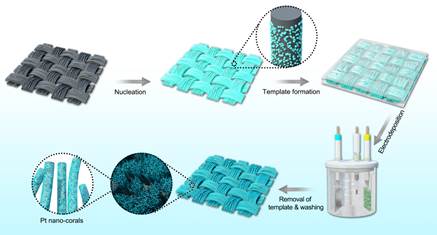 图1. 3D珊瑚形貌Pt纳米线/碳纤维布电极合成过程示意图