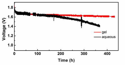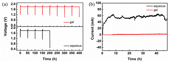 在实际应用中,用于不间断电源的电池需要在浮充条件下工作。浮充可以弥补电池自腐蚀而损失的能量。为加速试验,在60 °C的烘箱中测试电池在浮充下(在1.8 V的恒定电压下充电2天)的循环性能。基于凝胶电解质的ZNB可以工作近400 h,容量没有明显衰减。而且使用凝胶电解质的ZNB在浮充电时的电流(约2 mA)要比水电解质(约55 mA)的电流更低。这意味着与KOH水溶液相比,使用凝胶电解质的ZNB需要更少的能量补偿自腐蚀损失的能量。