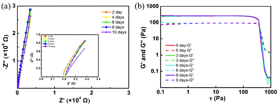 图3 (a)用带排气阀的密封袋包装的凝胶电解质储存10天后的EIS光谱(插图为高频区域的放大图);(b)凝胶电解质弹性模量(G')和粘性模量(G'')随时间的变化。