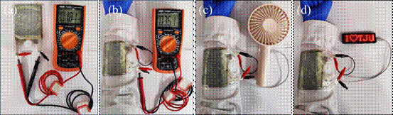 图8 开路电位(OCP)照片:(a)单个镍锌电池,(b)两组串联镍锌电池的;由两个弯曲的串联锌镍电池供电演示图:(c)电风扇和(d)LED屏幕。
