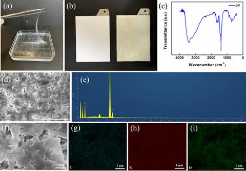 图1 (a)PAAK–KOH凝胶电解质的光学图像,(b)涂覆PAAK–KOH凝胶电解质前(左)和后(右)带隔膜的锌阳极的光学图像。(c)FTIR光谱,(d)SEM图像,(e)EDX分析,(f-i)PAAK–KOH凝胶电解质中C、K、O元素的映射图