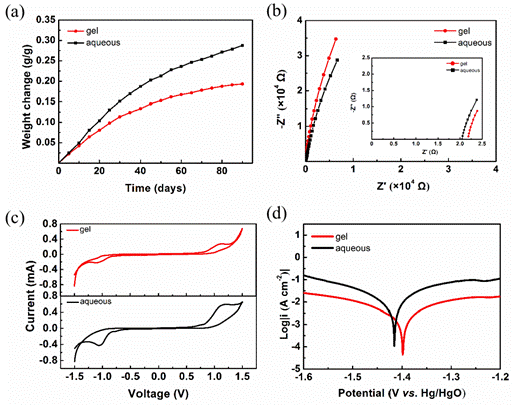 图2 (a)采用与组装ZNB相同的封装方式包装的电解质的重量随时间变化;(b)EIS曲线(插图为高频区域的放大);(c)KOH水溶液和PAAK–KOH凝胶电解质的电化学稳定性窗口;(d)Zn阳极在KOH水溶液和PAAK–KOH凝胶电解质中的Tafel极化曲线。