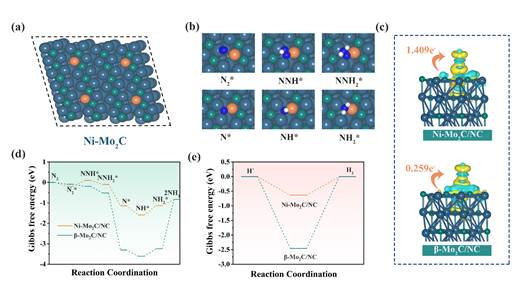 Figure 5. (a) Optimized atomic configuration of Ni-Mo2C, (b) optimized structures of intermediates over Ni-Mo2C/NC, (c) charge density difference calculations of N2 adsorbed on Ni-Mo2C/NC and β-Mo2C/NC catalysts, (d) Gibbs free-energy profiles of the NRR on Ni-Mo2C/NC and β-Mo2C/NC catalysts, and (e) H adsorption energy of Ni-Mo2C/NC and β-Mo2C/NC catalysts.