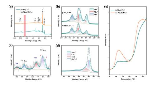 Figure 3. (a) XPS survey spectra and (b) high-resolution Mo 3d spectra of β-Mo2C/NC and Ni-Mo2C/NC-4 catalysts, (c) high-resolution Ni 2p spectrum, (d) C 1s spectrum of the Ni-Mo2C/NC-4 catalyst, and (e) N2-TPD profiles of β-Mo2C/NC and Ni-Mo2C/NC-4 catalysts.