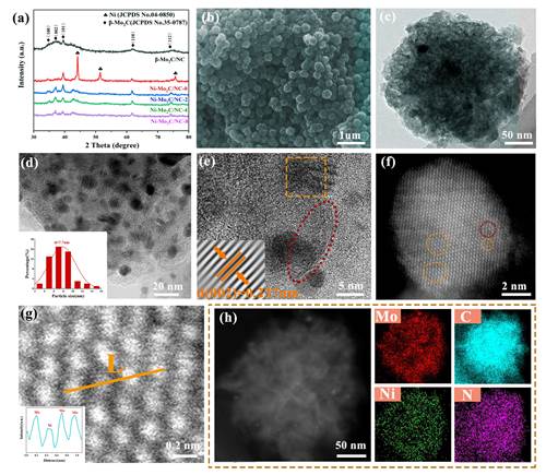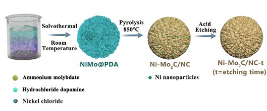 样品的制备是通过盐酸多巴胺,钼酸铵和氯化镍在弱碱性条件下合成镍-钼多巴胺前驱体,然后850 ℃烧结合成镍掺杂碳化钼,随后采用酸蚀工艺去除较大粒径镍颗粒,同时调节材料中镍的含量。
