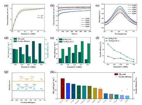 Figure 4. NRR electrochemical performance of Ni-Mo2C/NC-4 catalysts. (a) LSV curves of Ni-Mo2C/NC-4 in N2- and Ar-saturated conditions in a 0.5 M K2SO4 electrolyte, (b) chronoamperometry curves of Ni-Mo2C/NC-4 in a N2-saturated electrolyte at various potentials, (c) UV-vis absorption spectra of the electrolytes after an electrolysis reaction at various potentials for 2 h, (d) NH3 yield and faradic efficiency of Ni-Mo2C/NC-4, (e) mass-normalized NH3 yield rates and (f) Faradic efficiency at various applied potentials of β-Mo2C/NC and Ni-Mo2C/NC-4 catalysts,(g) isotopic labeling results of both 14NH4+ and 15NH4+ obtained from the NRR reaction using 14N2 and 15N2 as the nitrogen source, respectively, and (h) comparison of the electrochemical NRR activity for Ni-Mo2C/NC-4 with other Mo-based catalysts under ambient conditions.