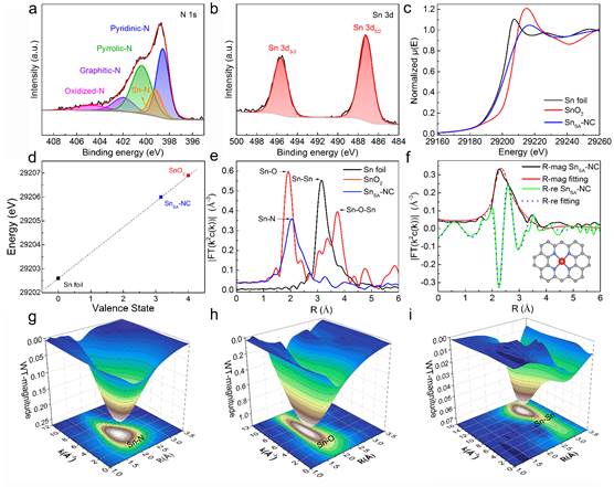 Figure 3: (a) N 1s XPS spectrum of SnSA-NC. (b) Sn 3d XPS spectrum of SnSA-NC. (c) Sn K-edge XANES of SnSA-NC, SnO2 and Sn foil. (d) Sn valance state determination based on linear fitting curve derived from Sn K-edge XANES spectra. (e) FT-EXAFS spectra of SnSA-NC, SnO2 and Sn foil. (f) FT of the k2-weighted EXAFS spectrum and fit in R space of SnSA-NC with the magnitude (red) and real component (green). WT for the k2-weighted EXAFS signals of (g) SnSA-NC, (h) SnO2 and (i) Sn foil.