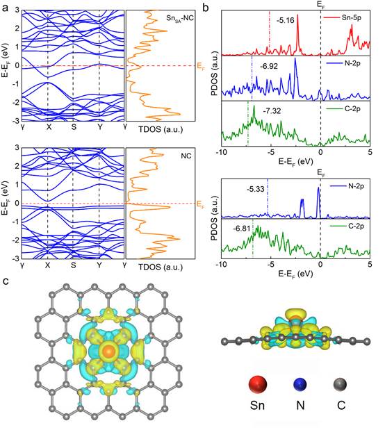 Figure 1: (a) Band structure and total density of states (TDOS) of SnSA-NC and NC models. (b) Projected density of states (PDOS) of Sn, N, C and N, C in SnSA-NC and NC, respectively. (c) Difference charge density of SnSA-NC configuration. Cyan and yellow represent the decrease and increase in electron density.