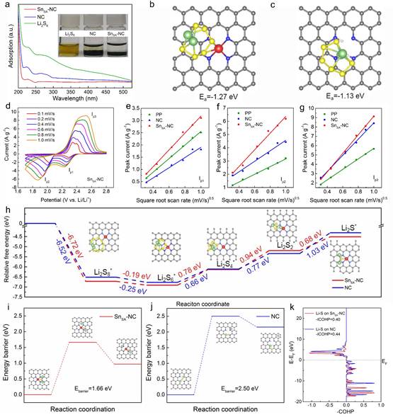 Figure 4: (a) UV-vis spectra of the Li2S6 solution after exposure to NC, SnSA-NC. Inset is the corresponding digital images of the solutions. (b-c) Configurations of the Li2S6 adsorption on SnSA-NC and NC by DFT calculation. (d) CV curves of the Li-S cell with SnSA-NC modified separator at different scan rates. (e-g) Plots of CV peak current versus the square root of the scan rates for the first cathodic reation (Peak 1), the second cathodic reaction (Peak 2) and the main anodic reaction (Peak 3). (h) Energy profiles for the reduction of polysulfides on NC and SnSA-NC. (i-j) The decomposition energy profiles of Li2S on SnSA-NC (i) and NC (j), the inset images in panels are the detailed decomposition path of Li2S on SnSA-NC and NC. (k) The Crystal Occupation Hamiltonian Population (COHP) analysis for the Li-S bonds in SnSA-NC and NC adsorption configurations.
