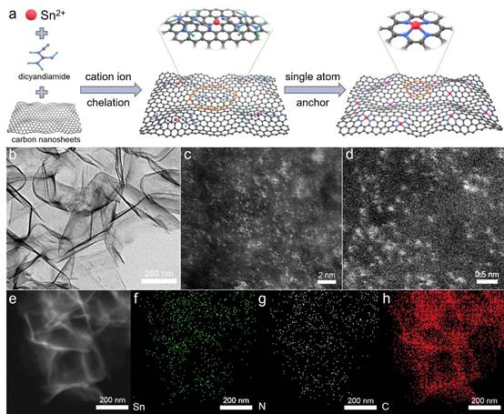 Figure 2: (a) Schematic demonstrating the synthesis process of SnSA-NC. (b) TEM image of SnSA-NC. (c-d) HAADF-STEM images of SnSA-NC. (e-h) HAADF images of SnSA-NC and corresponding EDS elemental mapping.