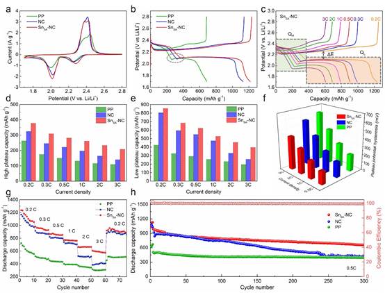 Figure 5: The electrochemical performance of Li-S batteries with bare, NC, SnSA-NC modified PP separators: (a) CV curves of the Li-S cells at 0.1 mV s-1; (b) Charge-discharge curves at 0.2 C; (c) Charge-discharge voltage profiles of SnSA-NC Li-S cell at various current rates; (d-e) High and low plateau capacities at different current densities; (f) potential hysteresis values between charge and discharge plateau; (g) specific capacities at various current rates; (h) cycling performance at 0.5 C and the corresponding Coulombic efficiency of SnSA-NC Li-S cell.