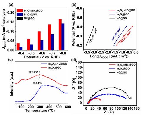 Fig. 4. (a) ECSA-normalized HCOO– partial current density of tested catalysts. (b) Tafel slopes of In2O3⊃NC@GO, In2O3@GO, and NC@GO. (c) CO2-TPD profiles of the In2O3⊃NC@GO and In2O3@GO. (d) Nyquist plots of tested catalysts.