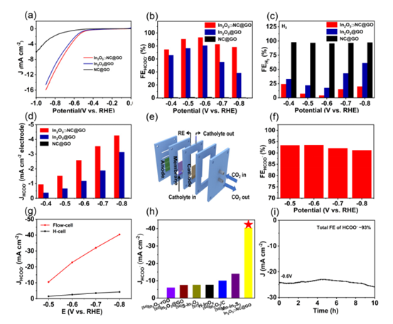 Fig. 3. (a) Polarization curves of In2O3⊃NC@GO, In2O3@GO, and NC@GO in CO2-saturated KHCO3 solutions. (b) FE values for HCOO–, and (c) FE values for H2 of In2O3⊃NC@GO, In2O3@GO, and NC@GO in a CO2-saturated 0.5 M KHCO3 electrolyte. (d) Geometrical HCOO- partial current densities. (e) Schematic illustration of the flow cell used in this work. (f) HCOO- Faradaic efficiency in the flow cell. (g) HCOO– current density of In2O3⊃NC@GO in different cells. (h) Comparison of JHCOO– at –0.8 V vs RHE of various In-based CO2RR catalysts. (i) 10 h electrolysis of In2O3⊃NC@GO at –0.6 V.