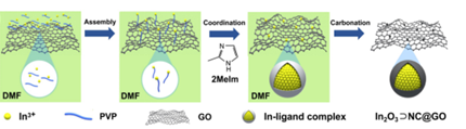 样品的制备是通过水热反应和碳化烧结制备的。在DMF溶剂中,In3+离子被PVP修饰的碳载体吸附,在160℃进行水热反应,之后在600℃煅烧3小时,最终形成In2O3⊃NC@GO样品。