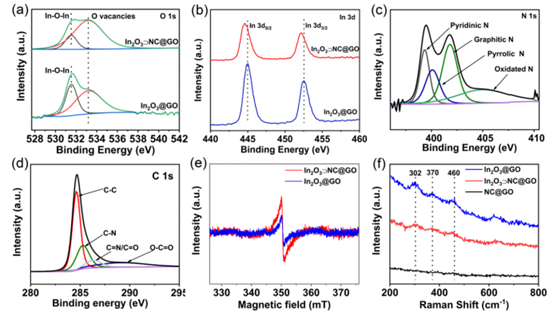 对电子结构进行表征从xps可以看出碳壳包裹负载氧化石墨烯的的样品氧空位浓度增加,同时In3d轨道向低能态偏移,In的电子密度增加,这是由于电子从O空位转移到了In。同时ESR中峰强增强,也表明样品氧空位浓度增加。在 xps C1s 峰,可以看出 C-N和C-N双键形成以及拉曼光谱氧化铟在302cm、370cm、460cm处特征峰减弱,进一步确定了N掺杂碳壳的形成。