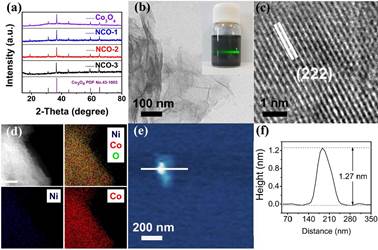图1(a)镍掺杂四氧化三钴系列样品的XRD图。NCO-2的(b)TEM及丁达尔效应照片,(c)HRTEM照片,(d)元素分布图,(e)AFM照片,(f)相应高度剖面图。