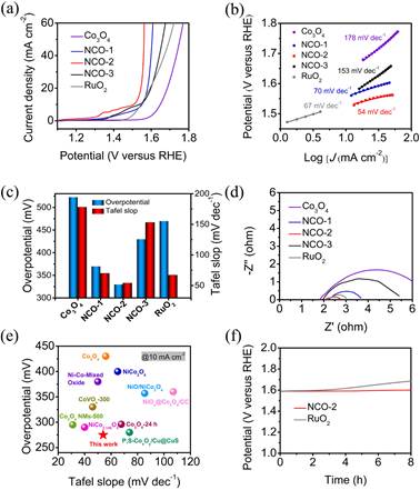 图3 所得Co3O4、NCO-1、NCO-2、NCO-3和商业RuO2在N2饱和的1 M KOH中的OER性能。(a)LSV图,(b)相应的Tafel图,(c)Tafel斜率和50 mA cm-2时的过电位,(c)EIS图,(e)NCO-2在10 mA cm-2处过电位与近期报道电催化剂的比较,(f)NCO-2和商业RuO2在10 mA cm-2下的计时电位(η-t)曲线。