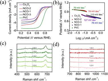 图4 制备催化剂和商业Pt/C(20%)在O2饱和的0.1 M KOH中的ORR性能。(a)LSV图,(b)相应的Tafel图。NCO-2在1 M KOH中不同电压下的原位拉曼图谱。图谱范围为(c)400~750 cm-1,(d)700~1100 cm-1。