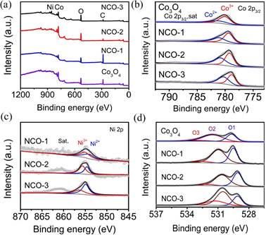 图2 Co3O4、NCO-1、NCO-2和NCO-3的(a)XPS全谱,(b)Co 2p3/2,(c)Ni 2p3/2,(d)O 1 s窄谱。