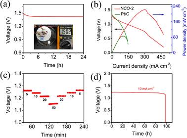 图5 以NCO-2为阴极催化材料的锌空气电池的性能。(a)开路电压,(b)极化曲线及相应功率密度,(c)倍率性能图,(d)电池10 mA cm–2的恒流放电性能。